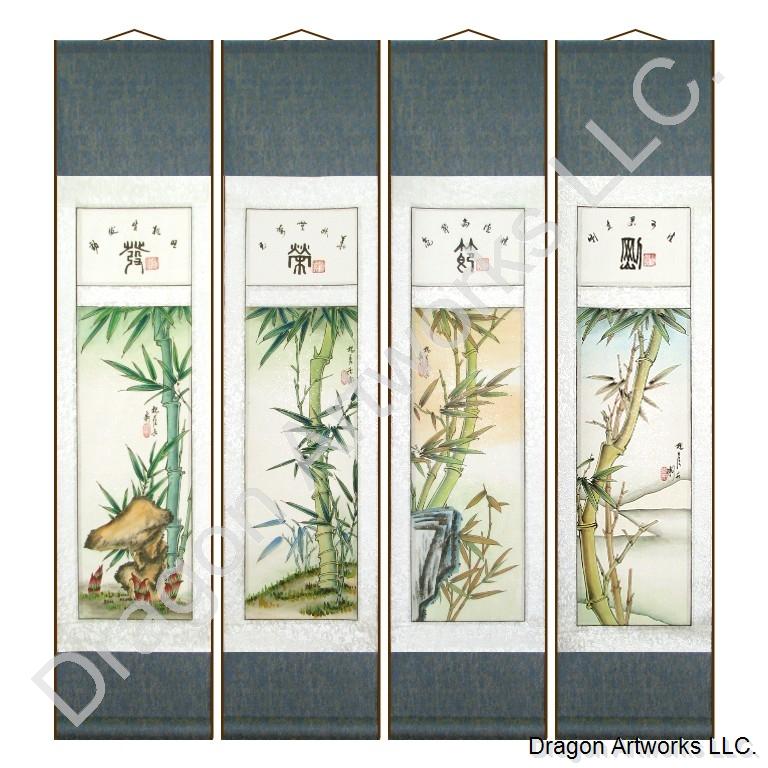 Bamboo is unique Chinese vegetation. This is a set of bamboo Chinese scroll paintings depicting different scenes of bamboo in four different seasons.