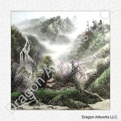 This Charming spring scenery Chinese brush art painting is mounted with white brocade and ready to frame.The spring mist mountain scenery painted a very beautiful mountain and waterfalls scenery in early spring. Looking at this charming spring scenery Chinese art brush painting, even can feel the spring fresh breath coming to us. Spring is the symbol of new life and that special feeling is captured in this Chinese brush painting.