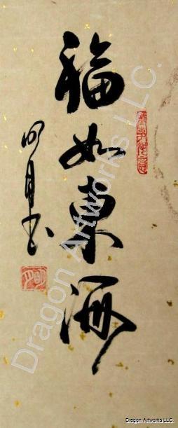 The Chinese symbols on this small painting are a proverb which means "Blessings like the Eastern Sea." This calligraphy painting measures 4 x 10 inches, approximately 6 x 12 inches including the poster board backing.The Chinese Blessings like the Eastern Sea proverb symbol shown in this image is hand painted and is sealed by the calligraphy artist. This Chinese Blessings like the Eastern Sea symbol calligraphy painting is painted on Beige rice paper and glued onto a piece of white poster board to prepare it for framing. The symbol for Blessings like the Eastern Sea calligraphy painting was measures 4x10 inches and is approximately 6 x 12 inches with the poster board backing. To view a few examples of how this calligraphy painting could look framed, click the link below.