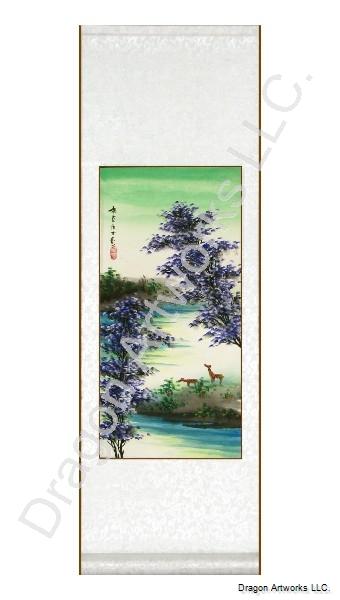 This lovely Chinese brush painting depicts romantic purple fall scenery and a pair of deer lovers, leading a life like fairies do.In the Chinese brush painting of deer in purple fall, the background is very romantic with purple trees and deer lovers. They seem to live in fairyland, very happily and comfortably.