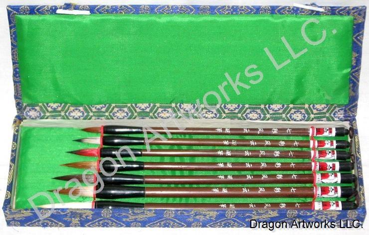 Chinese calligraphy brushes designed to produce fine brush strokes suitable for Chinese calligraphy or watercolor painting.Brush set includes seven calligraphy brushes used to for painting Chinese calligraphy symbols or watercolor paintings on rice paper. There are seven types and seven sizes included in this Chinese brush set, each brush is designed to produce a different stroke. These Chinese calligraphy brushes are designed to produce excellent brush strokes suitable for fine calligraphy painting and watercolor too. The size of the brush dictates the final size of the calligraphy character you will paint, so have a variety of sizes on hand so you can practice painting different Chinese symbols. You can use these brushes to paint Western calligraphy too and these brushes come in a beautiful gift box so they make excellent gifts.
