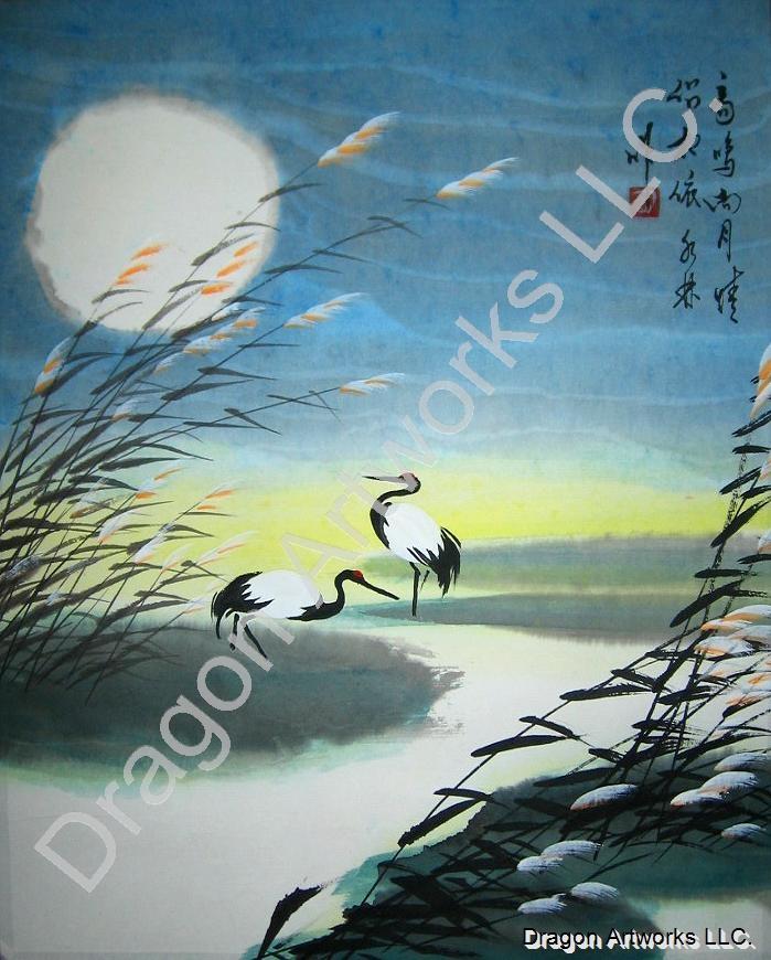 The Chinese cranes painting measures 10.5x13 inches, 13.5x16 overall.