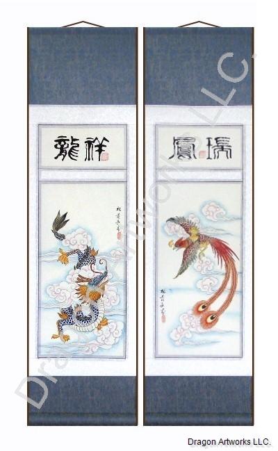 The dragon is well known as the symbol of the former Emperors of China, and the Phoenix symbolizes the Empress. So they always mean auspicious as the calligraphy symbols on this scroll set.This Chinese Dragon Phoenix Set Wall Scroll Painting Set was painted in a traditional Chinese painting style. These are NOT prints, they are work of art, the Chinese Dragon Phoenix Set Wall Scroll Painting Set was painted in China by a talented professional artist and carries a 100% guarantee of satisfaction.