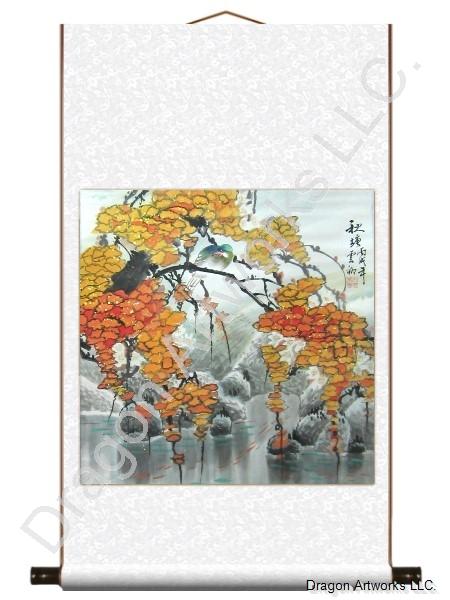 The Chinese fall pond painting scroll measures 28x52 inches.