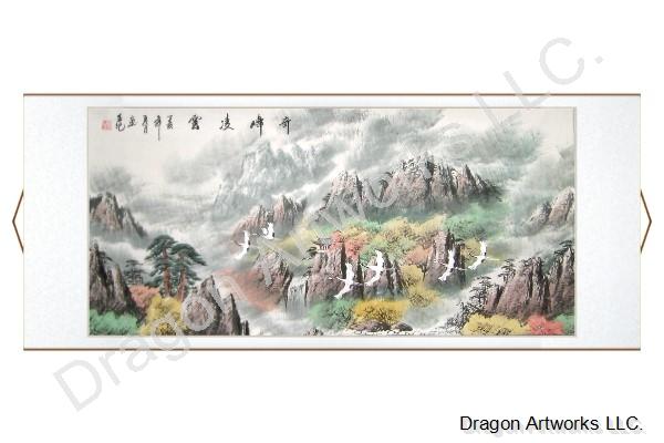 Peaks symbolize the height one’s career can reach while clouds represent the bright future. A group of cranes flying up to clouds in Chinese Landscape Painting of Peaks and Clouds features one’s endeavor to realize the dream.