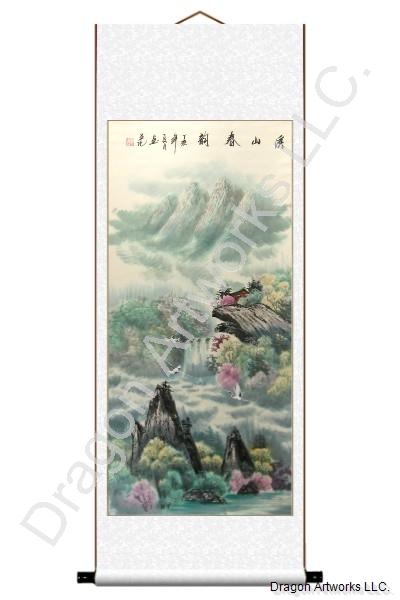 This Chinese landscape painting is a vivid depiction of the liveliness of springtime. There are mountain ranges covered with luxuriant pine trees, thriving flowers, rushing waterfalls and flying cranes. It is the best gift as a blessing for hope and harmony.