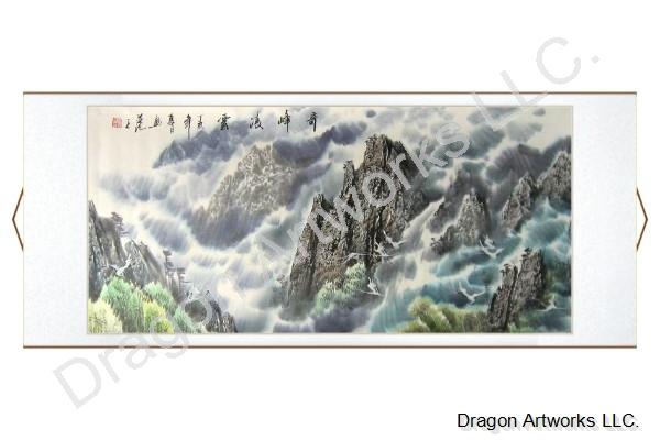 The title of this Chinese mountains cranes brush art scroll means wonderful peaks over the clouds. Crane symbols longevity, happiness and peace in Chinese culture. In this Chinese mountain cranes brush painting the cranes freely fly in the mountains. The flowing clouds show us how high the mountains.