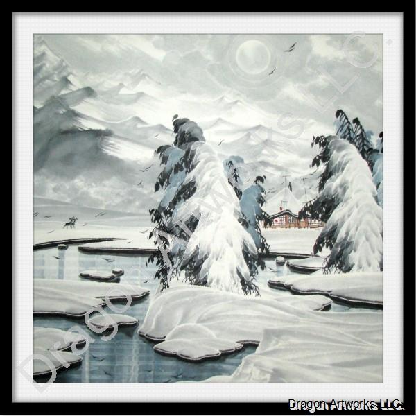 This Chinese painting depicts a snow-covered winter countryside which is located by the clear creek, between the forest and the mountain. In the wintry day, everything is decorated with the white snow.