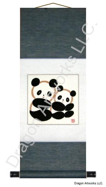 The panda is China's national treasure, a popular subject of modern Chinese artists and a symbol of peace.This Chinese brush art painting wall scroll depicts two Chinese pandas and measures about 12x34 inches in size. The Chinese pandas painting wall scroll is made using beautiful blue silk brocade material and a black scroll rod. It was painted by Beijing, China artist Mo Yun and was sealed by the artist.