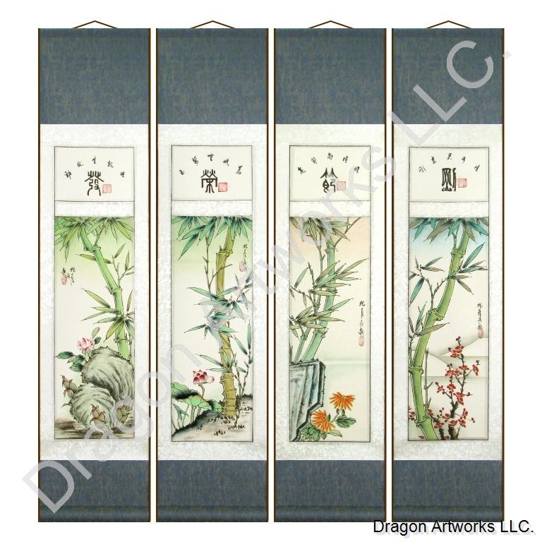 A set of Chinese scroll painting depicting bamboo and flowers, a perfect decoration for one’s home.