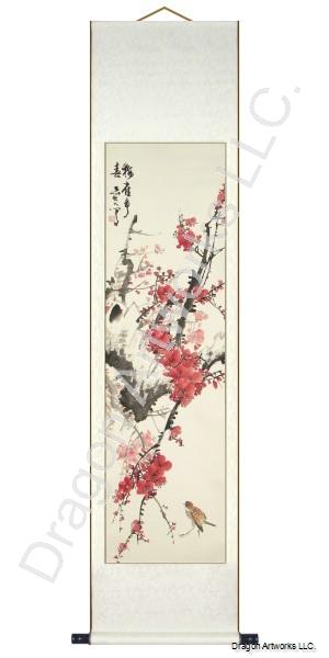 A beautiful Chinese Scroll Painting of blooming red plum blossoms, which are so attractive that a little sparrow couldn’t help being fascinated by them.