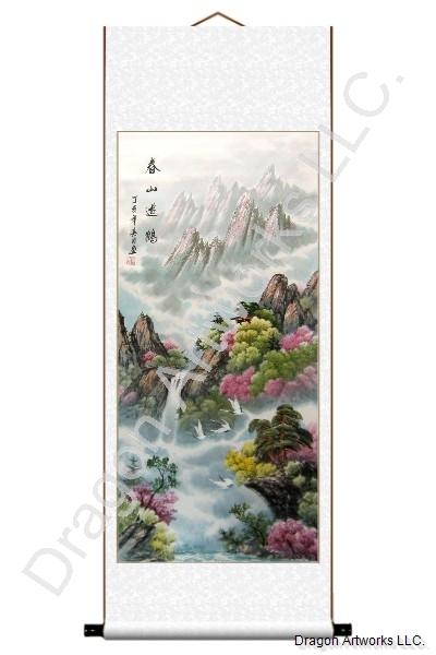 This Chinese scroll painting presents you a vision of paradise. The spring mountains are filled with vibrant colors. The water and the clouds merge into a whole. And the cranes, which symbolize longevity, are flying by. This is a wish for future prosperity and fortune.