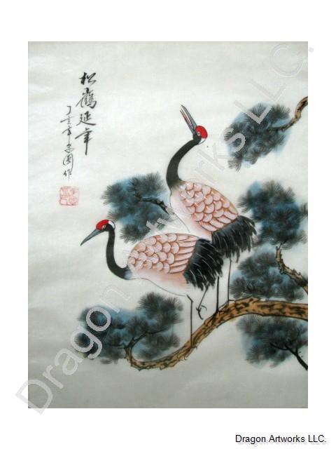 Cranes in Chinese culture are considered fairy birds, they are pure and elegant. Pine trees are very tall, they almost reach the sky. These two form a scene in heaven in the Chinese silk painting of cranes on pine trees. It is really a pleasure to see such a delightful painting.