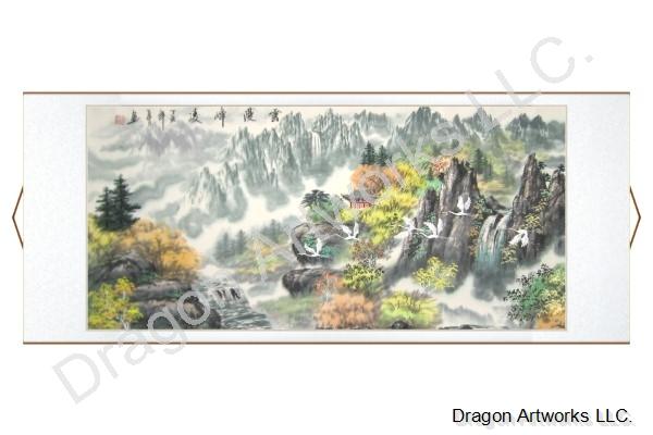 This title of this Chinese cranes waterfall temple cranes landscape brush painting means clouds overflow peaks. This Chinese brush painting is an original artwork and ready to hang but you may have it framed by your local frame store if you wish to create a truly spectacular presentation and protect this beautiful artwork.