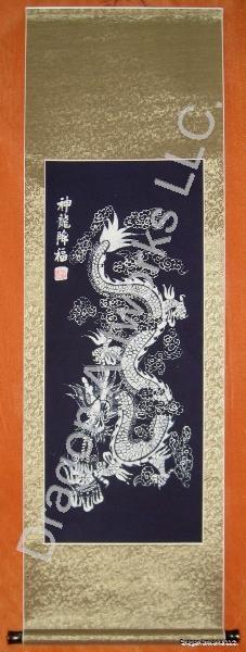 Chinese wax dye wall scroll depicting the most powerful animal, dragon, spitting its ball, meaning that it pours out luck on you.In Chinese culture, dragon is a very auspicious animal and its ball is the life of it. You see in the wax dye Chinese wall scroll of dragon, it is spitting out its ball, showing that it pours out all its power and luck on you.