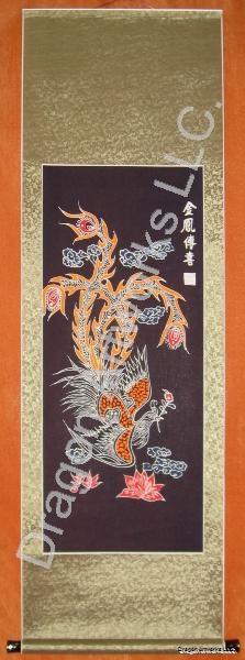 A beautiful wax dye wall scroll of phoenix, an animal that is believed to bring luck.The Chinese wax dye wall scroll of phoenix is a very beautiful painting. The colors were well used and show the elegance of phoenix very well. Other than being beautiful, phoenix is an auspicious animal that can bring good fortune to your family.