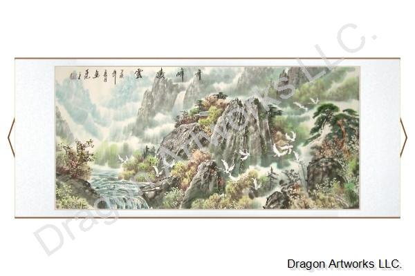 This title of this Chinese cranes waterfall temple landscape brush painting means wonderful peek over clouds. Crane is the symbol of happiness, longevity and peace.