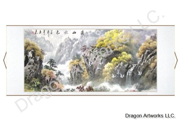 This title of this Chinese cranes mountains wall scroll painting means brook mountains fall scenery. Many cranes which symbol the auspicious, longevity and peace are dancing around the waterfall.