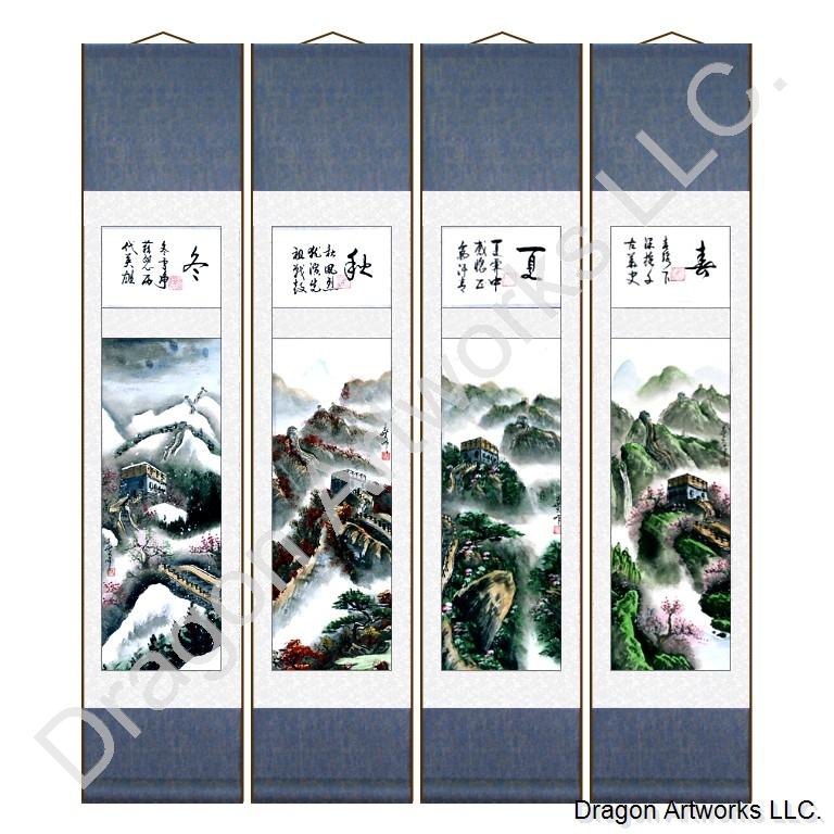 This detail Chinese great wall 4 seasons painting scroll set measures approximately 9x40 inches.