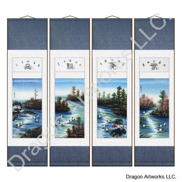 A beautiful scroll set for anyone who appreciates fine art, cranes symbolize both longevity and peace in Chinese culture.The calligraphy above each brush painting is written in an ancient Chinese style. From left to right, the big calligraphy of the paintings are chun (spring), xia (summer), qiu (autumn), dong (winter).