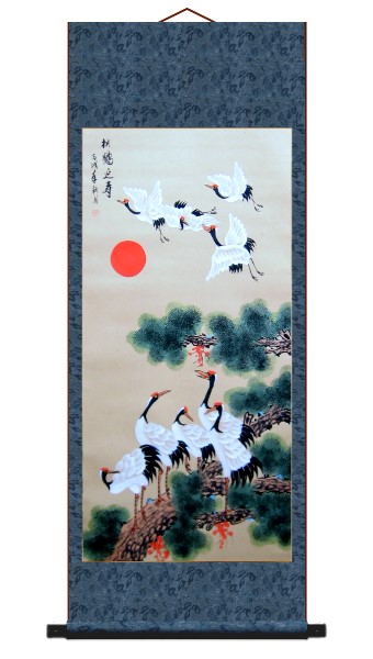 The words written on this Chinese painting is an idiom, which means pine tree and cranes prolong life. There are nine cranes in this scroll painting, and because the pronunciation of the word nine sounds for a long time it also symbolizes longevity. The vivid different posture of the cranes shows the artists ability to paint this beautiful bird.