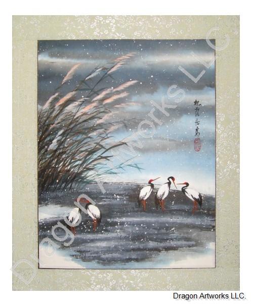 The background of the cranes in snowy winter night Chinese brush painting is very poetic. The cranes are playing happily in a beautiful scene. This makes the painting very delightful to see.