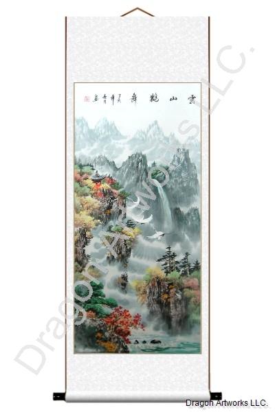 The title of this Chinese scroll painting in Chinese is Yun Shan He Wu, which means clouds mountains dancing cranes.This Chinese scroll painting shows us an early fall landscape scenery. A temple is surrounded by the trees on the hill. The crane is auspicious bird and is the symbol of peace and longevity in Chinese culture.