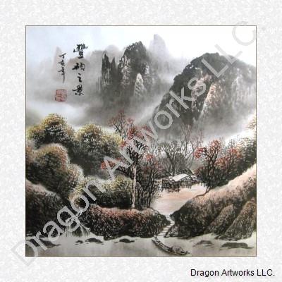 This fall mountain scenery Chinese brush painting measures about 23x23 inches. The painting on rise paper part is about 19x19 inches.
