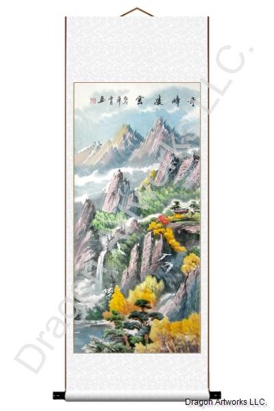 The title of this fall peaks fog waterfall Chinese scroll painting means the high wonderful peaks reach the clouds, and hints the big ambition.There is a temple in the middle mountain on this fall peaks fog waterfall Chinese scroll painting. With the dancing cranes shows us a peaceful and pure scenery.