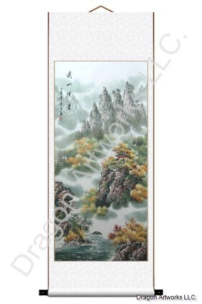 This fall temple mountain Chinese art scroll painting is 100% hand painted and measures about 27x68 inches.