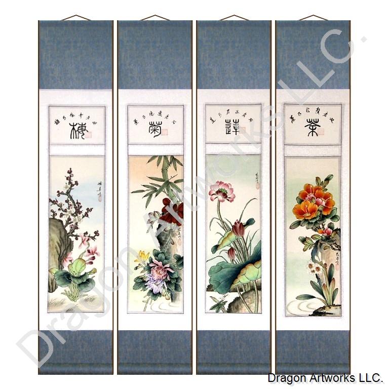 The four noble flowers detail Chinese painting scroll set measures approximately 9x40 inches.