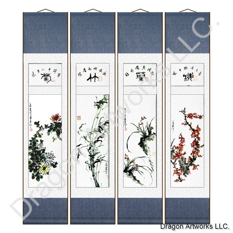 This wall scroll painting set depicts 4 beautiful and noble plants that are very popular and highly revered in China.The calligraphy on the painting is written in the ancient Chinese style. From right to left, the big calligraphy of the first painting is mei (plum blossoms). The small words on the top means plum blossoms has the strength of spirit.