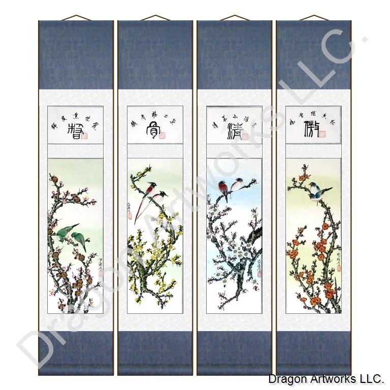 The four plum blossoms and birds detail Chinese painting scroll set measures approximately 9x40 inches.