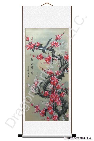 Magpie, the bird of joy is a good omen and brings joy with it. This is a very nice gift to express congratulations, especially for a wedding.The title of this plum blossoms scroll painting is a Chinese idiom called joy coming up to the tip of the brow. This Chinese plum blossoms scroll art painting comes from a Chinese idiom.