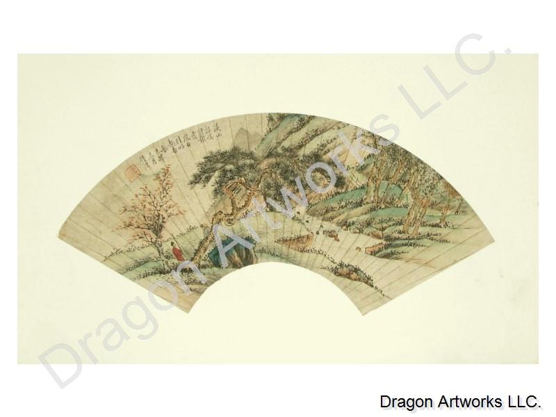 This Chinese landscape painting is painted in the shape of a fan and was designed to have the appearance of an antique painting, although it is not.