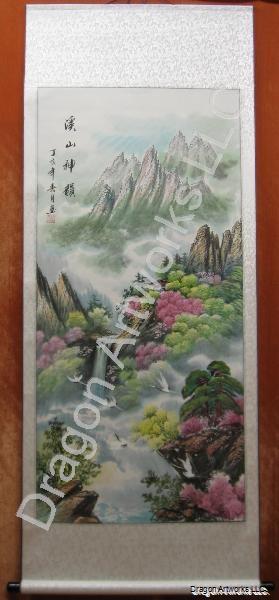 A Chinese wall scroll painting featuring cranes and a waterfall in the mountains of southern China. A 100% hand painted original artwork, this is not a print.