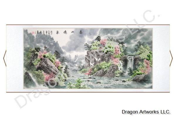 The title of this scroll painting is written in Chinese Calligraphy symbols and means the spring mountains and the ringing spring.This is a Chinese horizontal wall scroll painting of spring mountains and the water of the spring makes beautiful sounds as it travels through the mountains in the spring time.