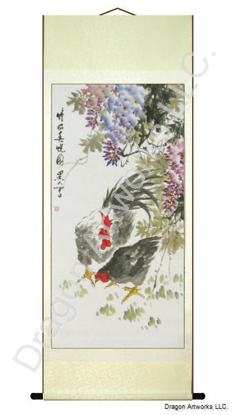 This roosters and wisteria flowers Chinese wall scroll painting is 100% hand painted.