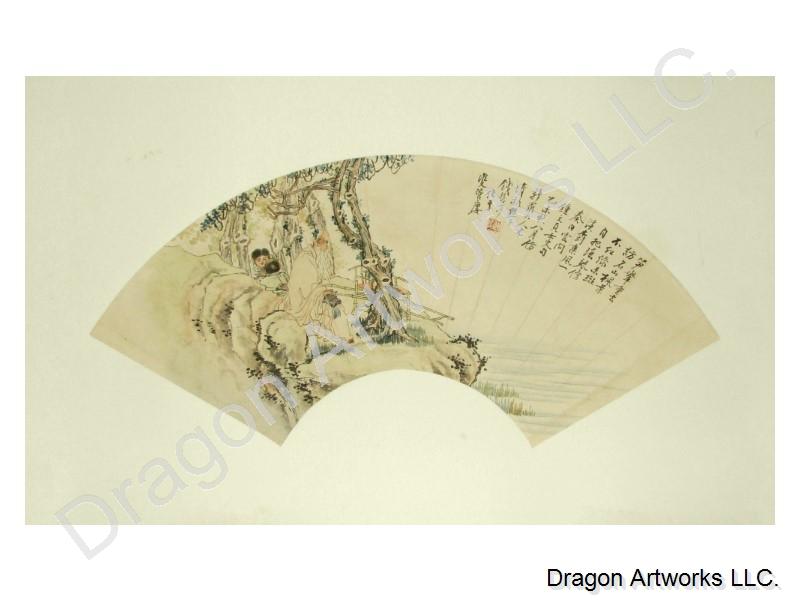 This antique look fan shaped Chinese painting depicts a very serene scene, as an old man looks out over a large lake while two children play beside him.