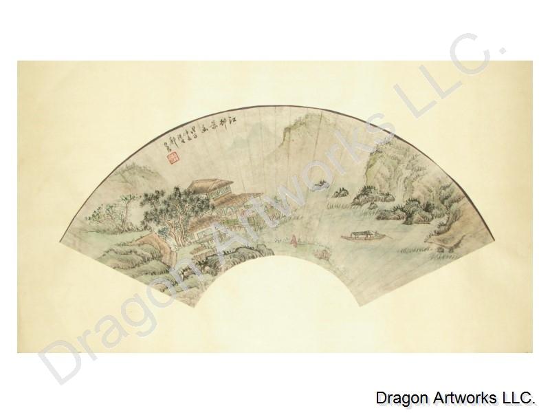 A ready to frame Chinese landscape painting, in a fan shape, with an antique look. The scene depicts a small inn on a river that winds its way through mountain scenery.