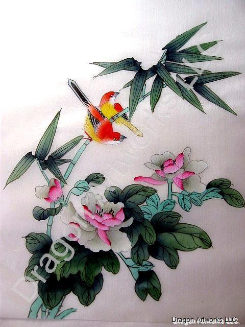 This listing is for a Silk Red and Yellow Birds, Bamboo and Pink Flowers Painting, which measures 8.5x11 inches and is shown in the picture on the right. Our Silk Red and Yellow Birds, Bamboo and Pink Flowers Painting is a 100% hand painted artwork, and was painted in an Oriental style in Beijing, China. The Silk Red and Yellow Birds, Bamboo and Pink Flowers Painting and all of the other Chinese silk paintings listed here on this Web site are hand-painted on silk fabric. We recommend that it be framed by a professional frame store, unless you first have it mounted using our custom mounting services..