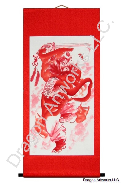 You see a fierce man holding a sword in this majestic wall scroll, he kills anything evil.
