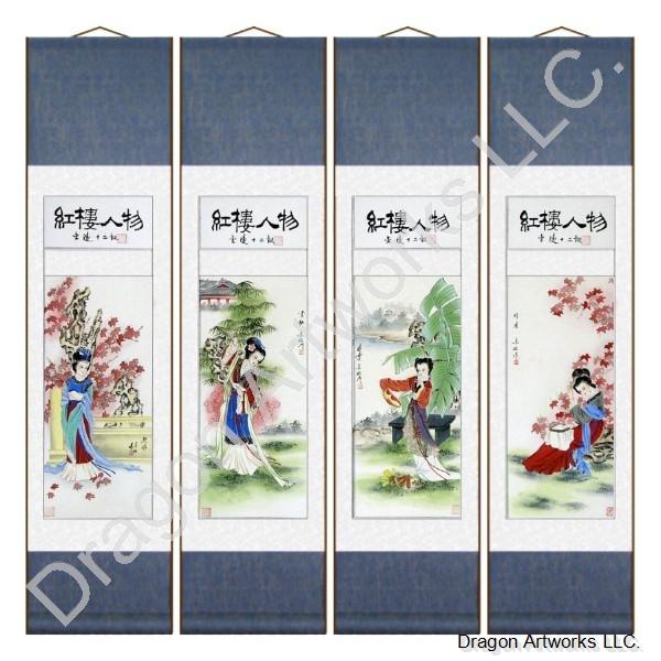 This wall scroll painting set depicts 4 beautiful women that are the characters of the Dream of the Red Mansion.The calligraphy on the painting is the ancient Chinese style. The big calligraphy on the top means the characters of the Dream of the Red Mansion. The small words under those means twelve beauties in Jin Ling.