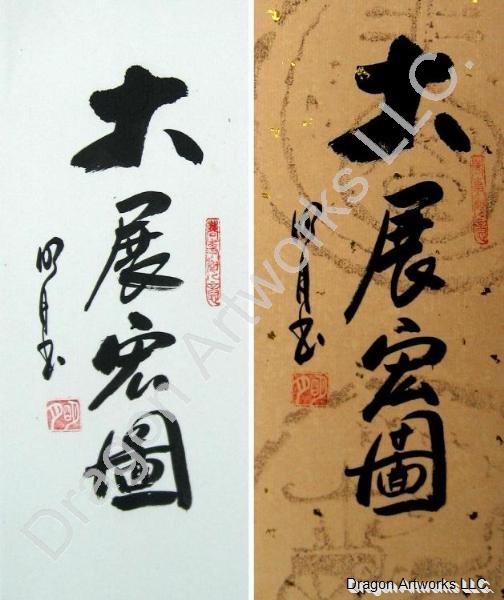 This Chhinese calligraphy symbol painting is a proverb meaning "Undertake Great Ambitious." The long seal on the right upper right hand side means "Everything is as One Wishes."The Undertake Great Ambitious calligraphy symbol painting measures 4x10 inches (6x12 inches including poster board). The seal on the upper right hand side of this calligraphy painting says Everything is as One Wishes. The Undertake Great Ambitious calligraphy symbol painting is painted on COLOR rice paper and is very easy to frame, even an amateur can frame this painting. This painting can be framed by a local frame shop, but you can easily get good results framing it by yourself. This calligraphy painting of the Chinese symbol for Undertake Great Ambitious is also sealed with the name of the artist Ming Yue. Please click the link provided below to see examples of these calligraphy paintings framed.
